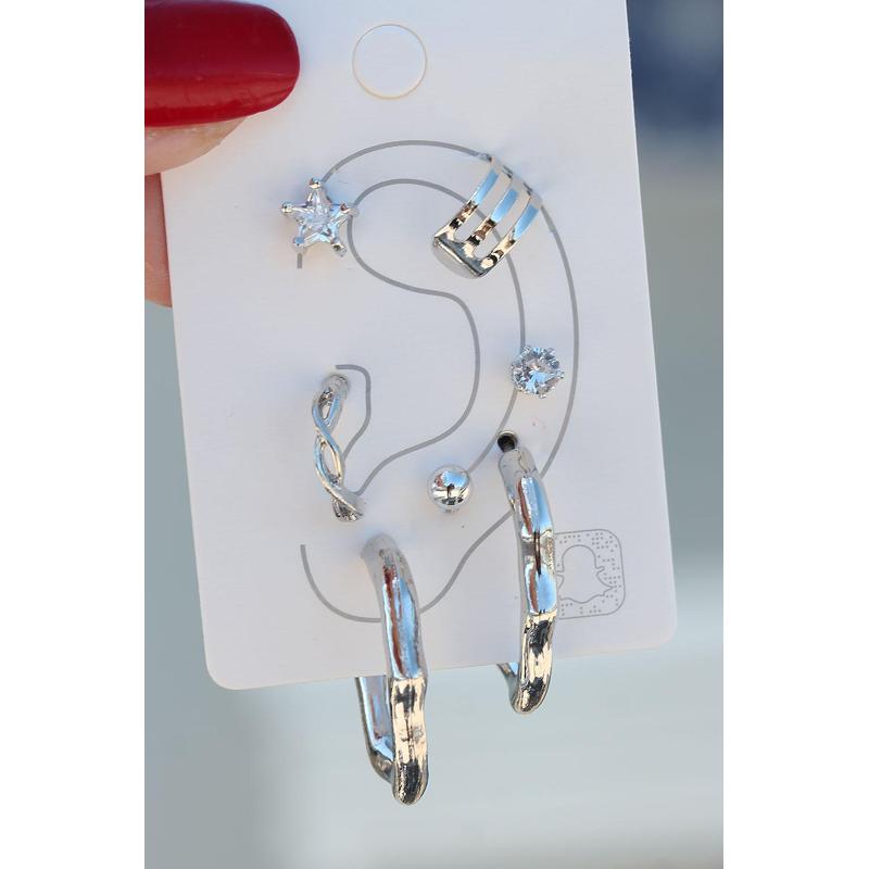 Çokgen Gümüş Metal Halka Model Zirkon Taşlı Kıkırdak Küpe Seti
